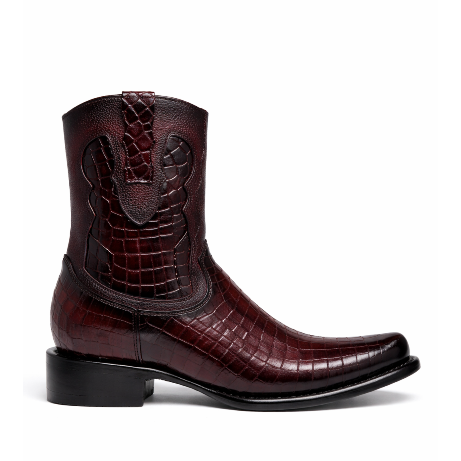 Fabricado con piel de res en acabado cocodrilo, este botín ofrece durabilidad, comodidad y una presencia impecable. El cierre lateral con cremallera facilita el calce, mientras que su punta estilizada y tacón bajo brindan un balance perfecto entre comodidad y estilo.
