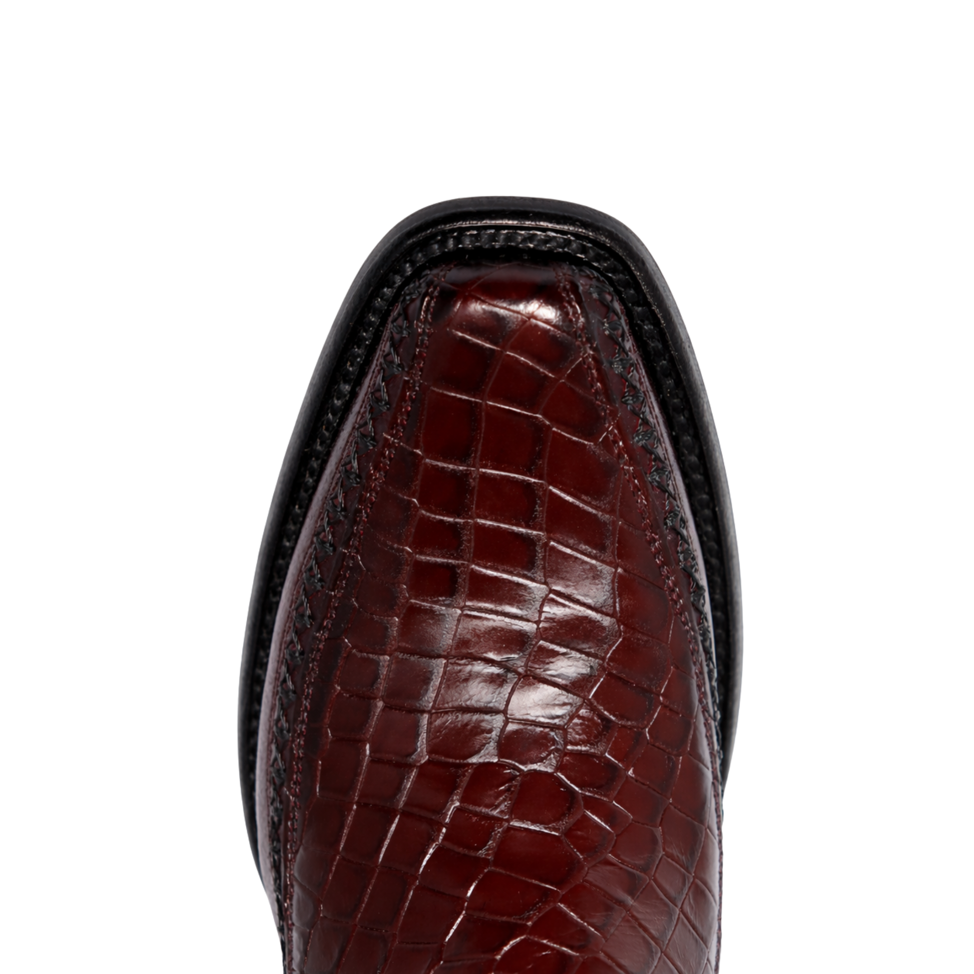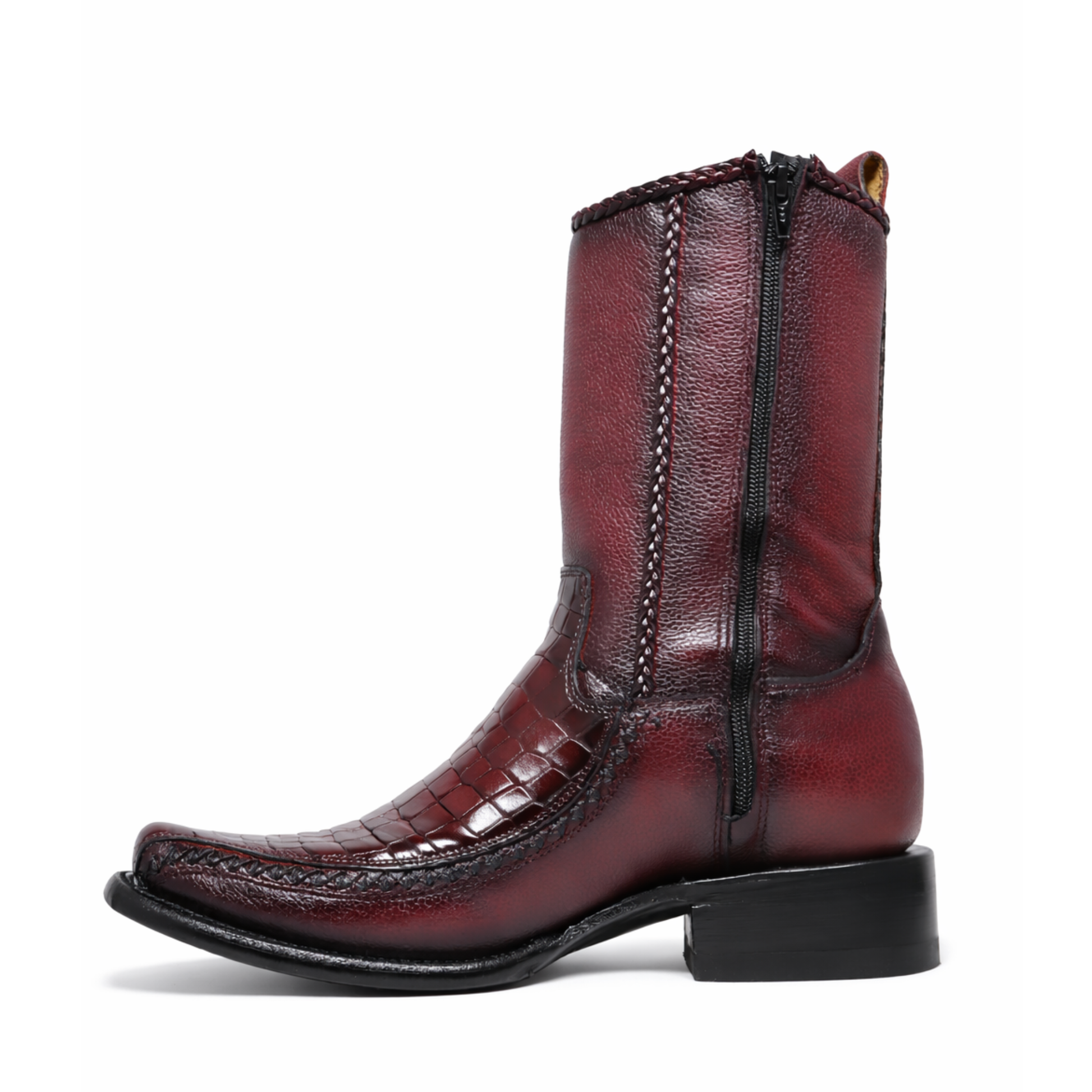 Confeccionado con material premium de imitación panza de cocodrilo, este botín ofrece una apariencia exótica y refinada, manteniendo comodidad y resistencia para el uso diario. Su tono vino profundo con acabado brillante realza cada detalle, mientras que la punta estilizada, el tacón bajo firme y los acabados artesanales garantizan una silueta elegante y una pisada segura.